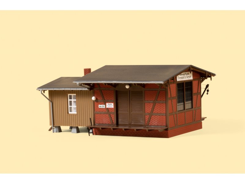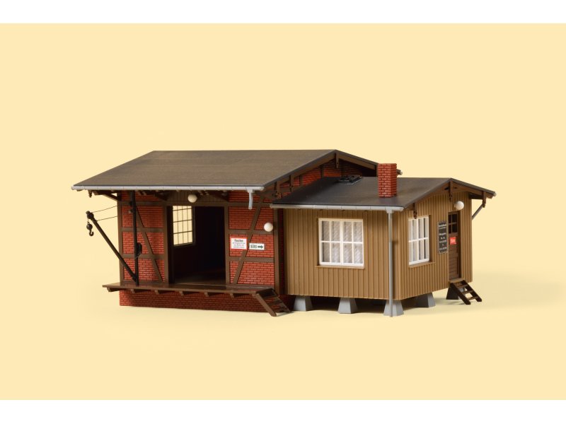 Brennstoffhandlungen gehörten früher fast überall zum Ortsbild. In Auhagen - eher kleinen - Modell gibt es Brennstoffe jeglicher Art. Mit der Sackwaage werden die Lieferungen für die Kunden vor der Verladung abgewogen. Für schwerere Güter gibt es am Lagerschuppen einen Wandkran, der beweglich ist. Das Klinkerfachwerkgebäude wird durch einen holzverschalten Büroanbau ergänzt. Für die Ausgestaltung liegen dem Bausatz Werkzeuge, wie z.B. Schaufeln, Besen und Schubkarren sowie Brikettstapel und Paletten bei.