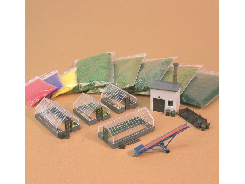 Mit diesem Bausatz können Sie eine kleine ländliche Gärtnerei gestalten oder unseren Artikel 12235 Gärtnerei ergänzen. Zum reichlich beigelegten Gestaltungsmaterial gehören: Mülltonnen, Förderband, feine Schaumflocken in pink, violett und gelb für Blumen, je 100 ml grobe und feine Schaumflocken in zwei verschiedenen Grüntönen sowie 150 x 120 mm Rollrasen.