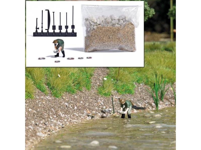Action Set für die realistische Belebung Ihrer Modellwelt. Set mit Goldwäscher-Figur, Goldwaschpfannen, Schürfwerkzeug sowie Sand und Geröll.Angaben zur Produktsicherheit