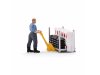 Typische Logistik-Szene von Transport- und Sicherungsarbeiten: Der Arbeiter führt einen Hubwagen, auf dem ein Transportgestell samt Absperrgittern mit Fußplatten verladen ist. Angaben zur Produktsicherheit