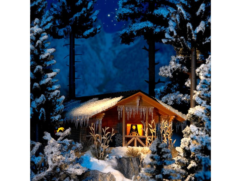 Romantisches Fertigmodell einer winterlichen Holzhütte. Mit schneebedecktem Dach und Eiszapfen. Die mit Sternen, Schwibbogen usw. dekorierten Fensterscheiben werden durch die eingebaute Beleuchtung effektvoll illuminiert. Innenausstattung mit Kamin und urigem Steinfußboden. Holzstapel inklusive.