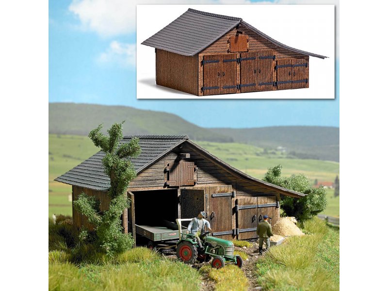 Bausatz für eine Gerätescheune aus echtem Holz, bereits fertig koloriert. Drei Holztore mit filigranen Scharnieren und Griffen zum Öffnen. Luken zum Dachboden mit Klappläden zum Öffnen. Mit altem Schieferdach. Auch als zweiständiger Feldbahnlokschuppen oder PKW-Garage verwendbar. Aussparungen für Feldbahngleise im Boden. Abstand von Schienenmitte zu Schienenmitte: 30 mm. Durchfahrtshöhe große Tore: jeweils 29 mm, Durchfahrtsbreite: 28 mm. Durchfahrtshöhe kleines Tor: 22 mm, Durchfahrtsbreite: 25 mm. Länge der Scheune innen: 75 mm.