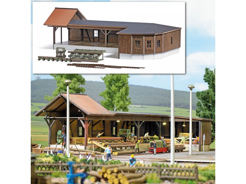 Der Bausatz dieses Sägewerkes aus echtem Holz ist an eine bis vor kurzen noch in Betrieb befindliche Anlage im thüringischen Neumühle/Elster angelehnt. Das große Gebäude mit dem interessanten Eck-Grundriss ist reichhaltig ausgestattet: Baumstämme, Sägegatter und Zuführung für das Rundholz mit Rollwagen und Gleisen. Alle Teile fertig koloriert.