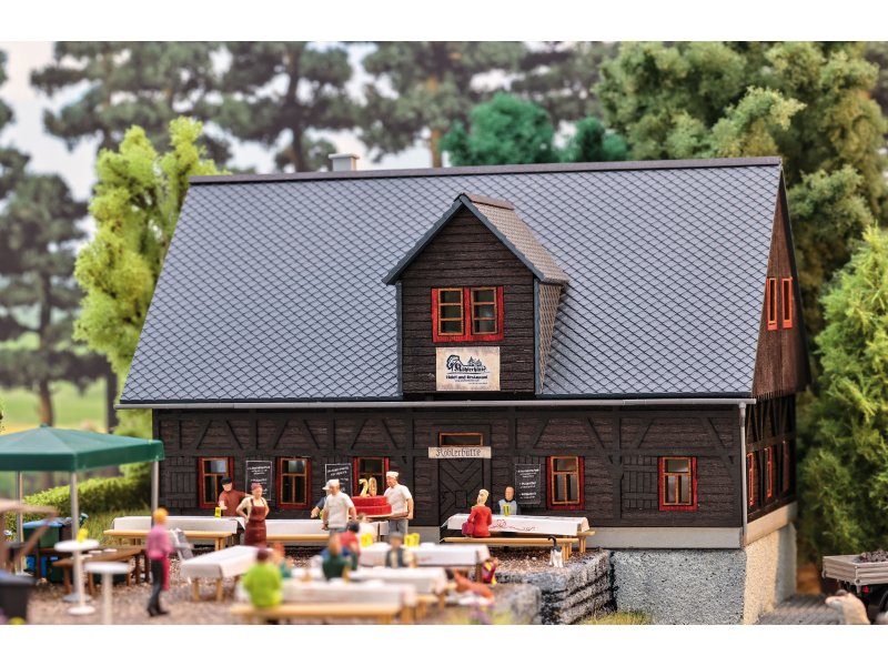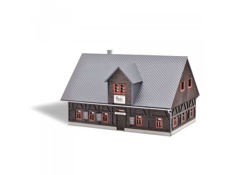 für ein superdetailliertes, rustikales Gasthaus nach einem Originalvorbild aus dem sächsischen Erzgebirge, wo die Köhlerei über viele Jahrhunderte ein weit verbreitetes Handwerk war. Aus Echtholz und in klassischer Holzbauweise gefertigt sind die aufwändigen Fassaden und auch Fenster und Türen. Alle Teile fertig koloriert.