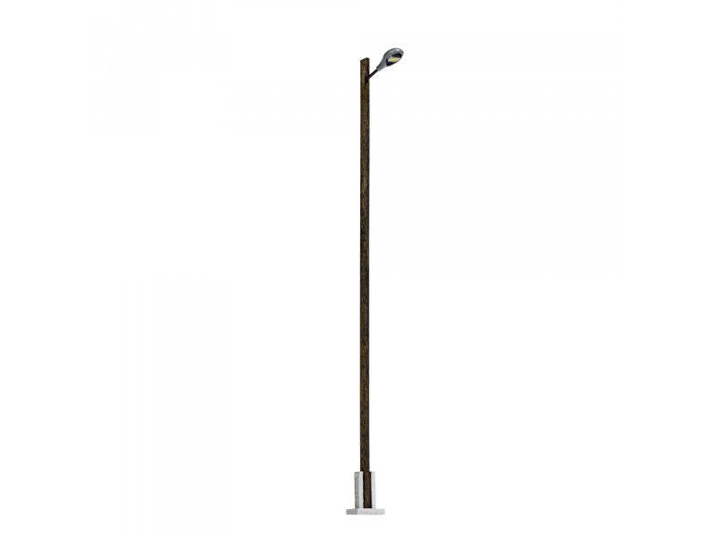 Universell einsetzbare Bahnhofsleuchte mit Mast aus echtem Holz. Auch für Industriegelände geeignet. Mit filigranem Lampenfuß aus Metall. Die ovale Leuchtenform stellt das Modell einer häufig eingesetzten Leuchtentype aus der Fertigung des ehemaligen VEB Leuchtenbau Leipzig (LBL) dar.