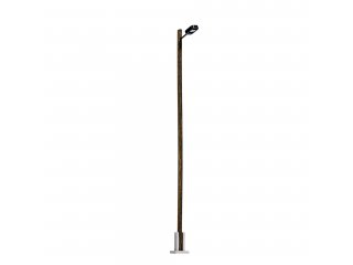 Universell einsetzbare Bahnhofsleuchte in eckiger Form mit Mast aus echtem Holz. Auch für Industriegelände geeignet. Mit filigranem Lampenfuß aus Metall.