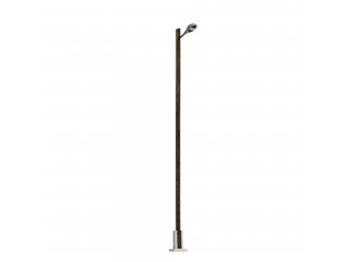 Universell einsetzbare Bahnhofsleuchte mit Mast aus echtem Holz. Auch für Industriegelände geeignet. Mit filigranem Lampenfuß aus Metall. Die ovale Leuchtenform stellt das Modell einer häufig eingesetzten Leuchtentype aus der Fertigung des ehemaligen VEB Leuchtenbau Leipzig (LBL) dar.