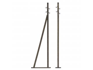 2 Freileitungsmasten aus Echt-Holz mit filigranen Isolatoren. Davon 1 Mast gerade und 1 Mast mit Seitenausleger. Fertigmodell.