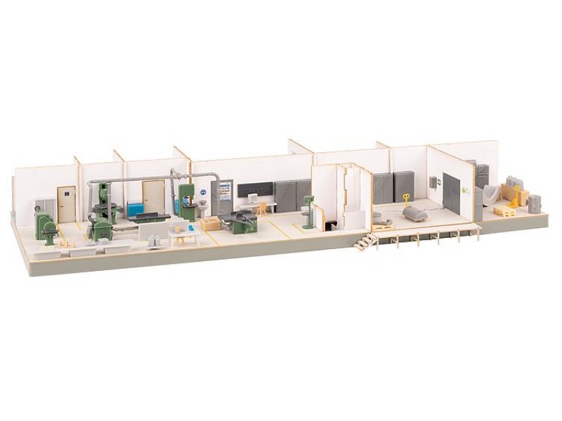 Längliches Flachdachgebäude mit umlaufenden Fenstern, das eine voll eingerichtete Werkstatt mit zahlreichen Holz- und Metallbearbeitungsmaschinen sowie umfangreichem Büromobiliar beherbergt.