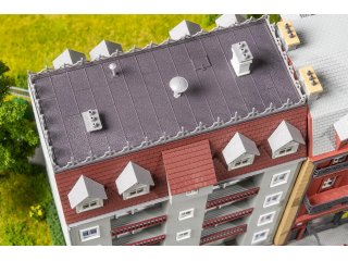 Ein Stück deutscher Seriengeschichte im Modellformat! Inspiriert von einem Wohnhaus aus der ARD-Serie »Marienhof«, bringt dieses Modell den Charme des fiktiven Kölner Stadtteils auf die Anlage. Das Mehrfamilienhaus mit seiner grauen Fassadengestaltung, sechs charakteristischen Balkonen und einem dunkelroten Ziegeldach in Sattelform ist ein ideales Modell, um Szenen mit Alltagsflair und städtischem Charakter darzustellen. Besonders auffällig: der flache Dachbereich, eingerahmt von umlaufenden schmiedeeisernen Zierelementen.