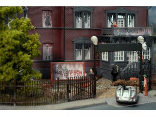 Huch, war das etwa ein Gespenst am Fenster der Villa? Diese erhebt sich majestätisch mit ihren blutroten Ziegelsteinen und dem düsteren schwarzen Dach auf der Modellbauanlage, während gruselige Totenköpfe von den Dächern und Emporen hinunterblitzen. Ein warnendes Schild verkündet eventuellen Besuchern: Hier wird Halloween gefeiert! Leicht wie ein Geist schwebt über dem Dach zudem ein orangener Heißluftballon und grinst mit seiner Fratze höhnisch auf die Szenerie herab. Um das Anwesen herum sind eine alte Kanone und Kürbisse platziert, die die Gruselstimmung dieses Sets vervollständigen. Wer würde sich vor diesem Miniatur-Schreckensspaß nicht fürchten? Inhalt: Villa mit Halloween-Schild, Dekorationselemente (Kürbisse, Kanonenkugeln und Totenköpfe), Kanone und Heißluftballon