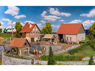 Bäuerliche Haus- und Hofanlage. Umfangreiches Modellensemble bestehend aus einem 2-stöckigen Wohnhaus mit Schindel- und Putzfassade, seitlichem Treppenaufgang und Storchennest auf dem Dachfirst, einer großen Scheune mit Flügeltor, einer kleinen Mühle mit Wasserrad und kleinem Holzanbau, einer überdachten Weinkelter sowie allerlei Ausgestaltungselementen, wie z. B. einem Jauchewagen, Fässer, Wannen und Säcke.