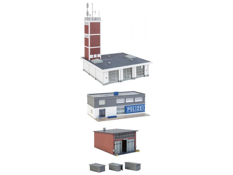 Voller Einsatz! Mehrteiliges Themen-Set mit Feuerwache, Polizeirevier, Reparaturhalle und drei Schuppen. In Nachbarschaft zu der großen Feuerwehrwache mit 3-ständiger Fahrzeughalle, Flachdach und dem Schlauchturm in Ziegelbauweise befinden sich eine zweigeschossige Dienststelle mit großem Polizei-Schriftzug sowie eine 1-ständige Reparaturhalle mit Falttoren und einem Pultdach. Lagerkapazitäten bieten drei freistehende, abschließbare Profilblechschuppen.