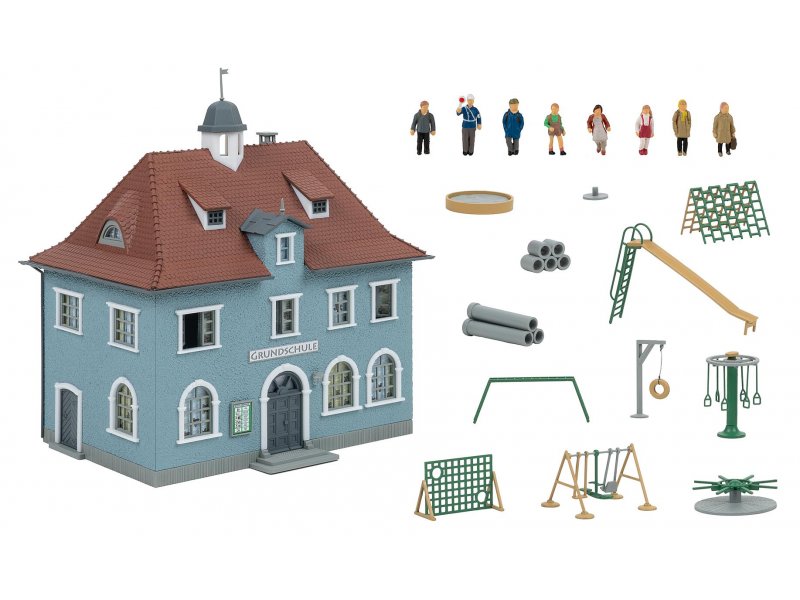 Das Aktions-Set »Schulbeginn« enthält ein charmantes Grundschulgebäude, welches in freundlichem Hellblau strahlt und mit seinem verspielten Türmchen auf dem rot geziegelten Dach den ersten Schultag einläutet! Eine große Rundbogentür lässt die Schüler eintreten und durch die weißen Fenster können sie das Treiben auf dem Pausenhof beobachten. Dort sorgen eine Vielzahl von Spielgeräten für Spaß und Bewegung. Schaukeln, Klettergerüste und ein Sandkasten laden zum Spielen ein. Ein Fußballtor wartet auf das nächste Match und ein Karussell dreht sich ausgelassen im Kreis! Passend hierzu enthält das Set außerdem noch acht Miniaturschüler, die die Szenerie beleben. Inhalt: Schulgebäude, 8 Figuren, Spielgerätschaften für den Schulhof (Schaukeln, Rutsche, Klettergerüste, Karussell, Sandkasten, Klettergeräte, Fußballtor)