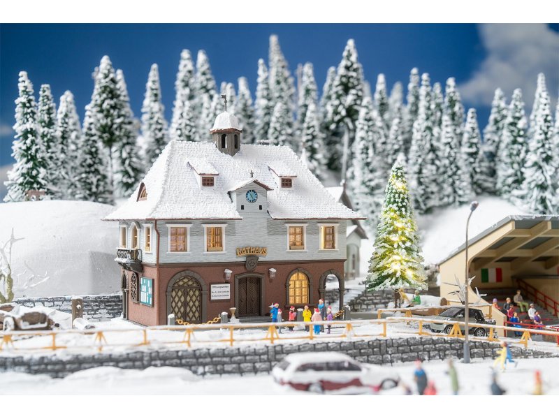 O Tannenbaum, o Tannenbaum – festlich erklingt der Gesang durch die Miniaturwelt. Vor dem funkelnd erleuchteten Weihnachtsbaum versammelt sich der kleine Chor, um gemeinsam vor dem Rathaus stimmungsvolle Weihnachtslieder zu singen. Das Rathaus selbst präsentiert sich in rustikalem Charme: eine Kombination aus Blau und Braun, mit dunklen Ziegeln gedeckt und einem verträumten Türmchen auf dem Dach. Inhalt: Rathaus, Weihnachtsbaum (und Beleuchtung), 7 Figuren