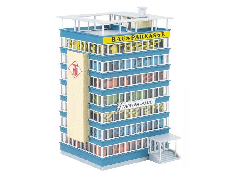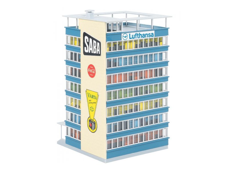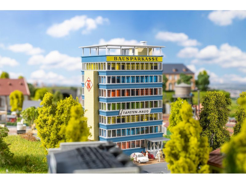 Modell 2293 – ein echter Klassiker: Das markante, mehrstöckige Hochhaus in Blau mit umlaufender Fensterfront und halbüberdachter Dachterrasse kommt zurück. Mit Bausparkasse, Lufthansa und Tapeten-Haug im Gebäude, ergänzt durch ikonische Werbemotive wie Varta und Coca-Cola. Inklusive Nachdruck eines FALLER-Magazins.