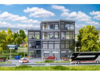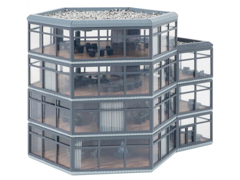 Moderner Bürokomplex mit Charakter! Dieser vierstöckige Bürobau überzeugt mit seiner futuristischen sechseckigen Grundform. Komplett verglast und mit einem dreistöckigen Treppenhaus ergänzt, wirkt die Architektur offen und leicht. Das unterste Stockwerk aus grauen Ziegelsteinen setzt mit seiner Maueroptik einen markanten Kontrast. Perfekt geeignet für jede moderne Stadtlandschaft im Modell.