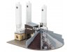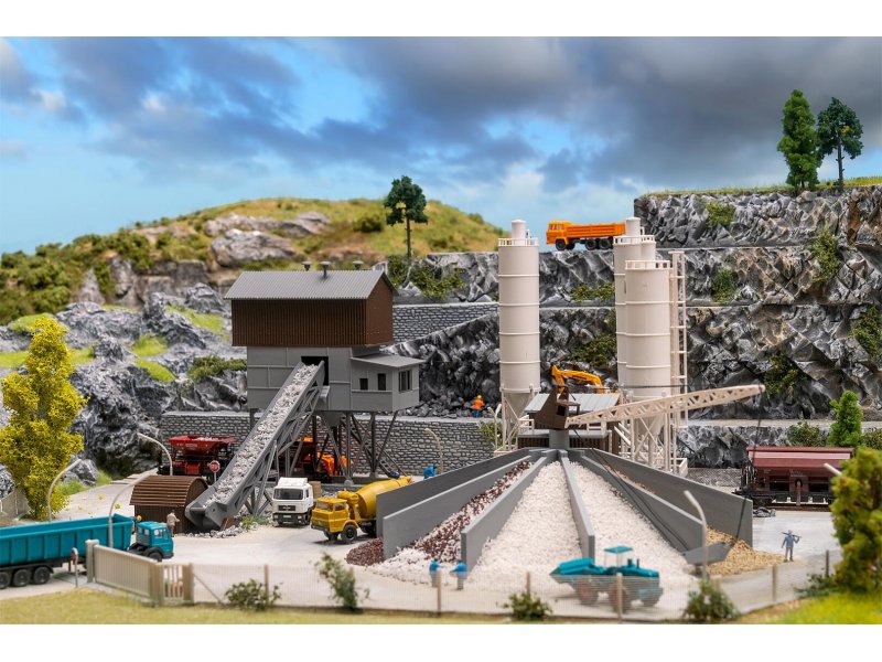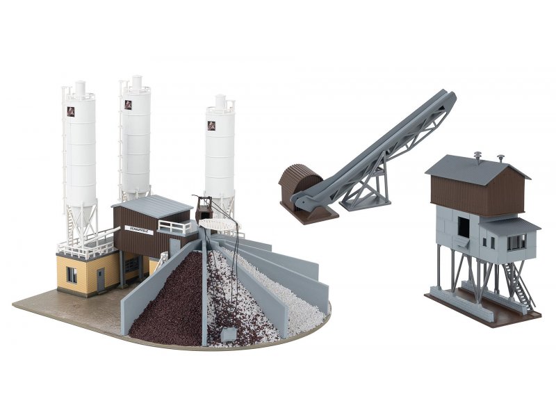 Im Betonmischwerk herrscht Hochbetrieb! Eine beeindruckende Mischanlage mit 3 Hochsiloreihen und einem Bürogebäude bildet das Zentrum. Eine Durchfahrt bietet den LKW die Möglichkeit, schnell beladen zu werden. Die Sandbunkertaschen sind für unterschiedliches Sand- und Kiesgut unterteilt und Sand in 3 verschiedenen Farben zur Ausgestaltung der Sandbuchten ist ebenfalls enthalten. Eine Kranvorrichtung und ein Kies-Verladesilo mit Förderband (ohne Funktion) liegen ebenfalls bei und ergänzen die Szenerie.