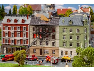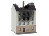 Vierstöckiges Altstadt-Mietshaus mit rauchgeschwärzter Stuckfassade und teilausgebranntem Dachstuhl.