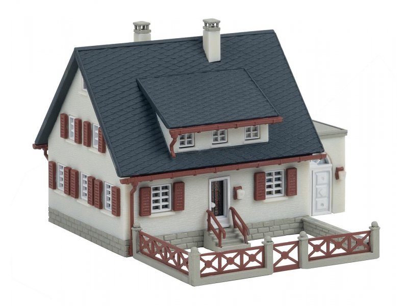 Ein graues Einfamilienhaus mit eingezäuntem Vorgarten und braunen Fensterläden. Perfekt für eine kleine Modellfamilie oder um die Vorstadt etwas auszuschmücken.