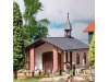 für eine Friedhofskapelle bzw. kleine Trauerhalle. Windfang, Eingangsportal, Fenster und die Fassade auf der Gebäuderückseite sind aus echtem Holz gefertigt und bereits fertig koloriert.