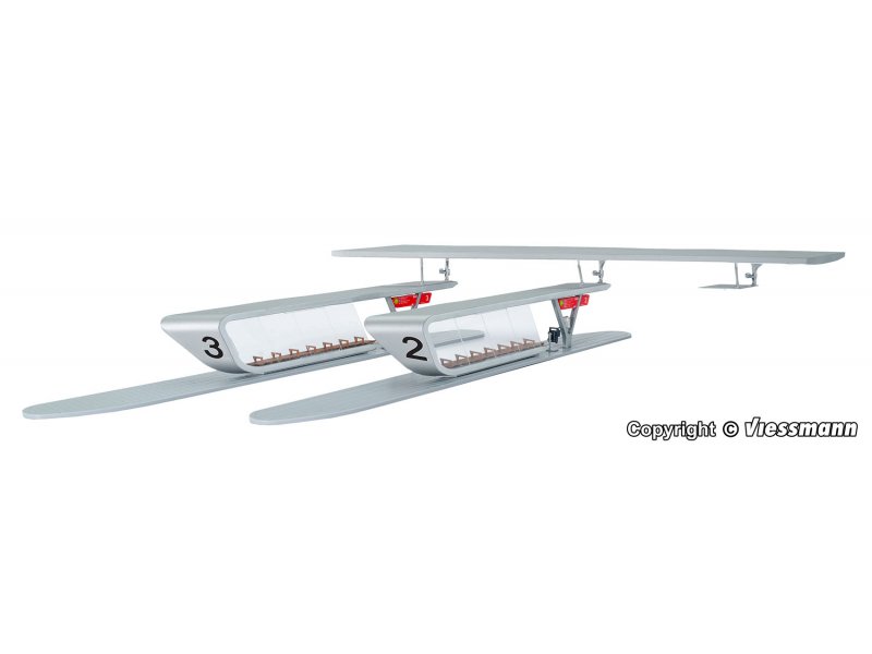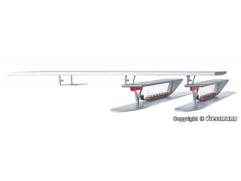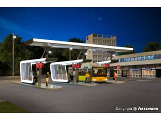 Das segelförmige Dach wird mit 2 Haltestationen geliefert und kann bis zu 3 Haltestationen Art. 39007 überspannen. Ideal geeignet zur Erweiterung von Art. 39006 Busbahnhof Hauptgebäude. 2 Deckenstrahler Art. 6338 von Viessmann liegen bei.