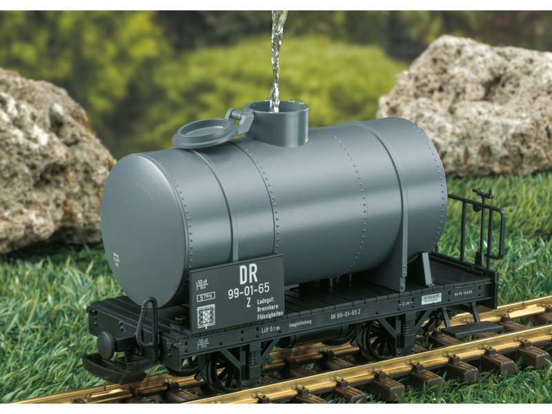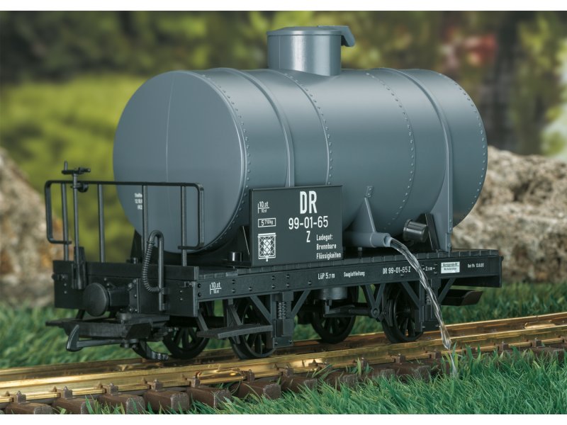 Modell eines Kesselwagens, wie er auf vielen Schmalspurstrecken der DR im Einsatz war. Originalgetreue Farbgebung und Beschriftung in der Epoche III. Der Kessel kann mittels Deckel auf dem Kesselscheitel befüllt und mittels unten angebrachtem Verschluss wieder entleert werden. Technische Funktion und Authentizität ganz wie beim großen Vorbild.