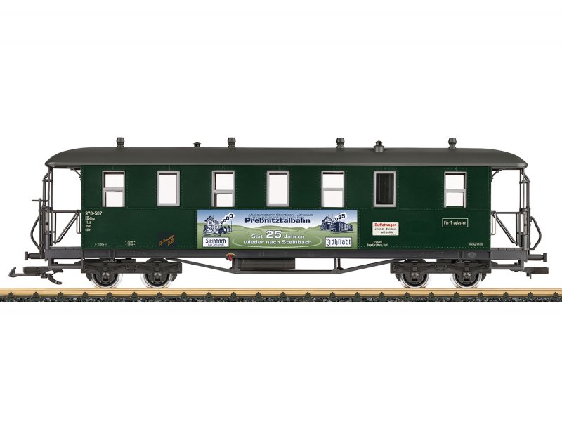 Modell eines 4-achsigen Reisezugwagens des diesjährigen Partners der Pressnitztalbahn. Originalgetreue Farbgebung und Beschriftung der Epoche VI mit dem Hinweis auf das Jubiläum "25 Jahre wieder nach Steinbach". Die Türen an den Plattformen sind zum Öffnen, komplette Inneneinrichtung. Metallradsätze.