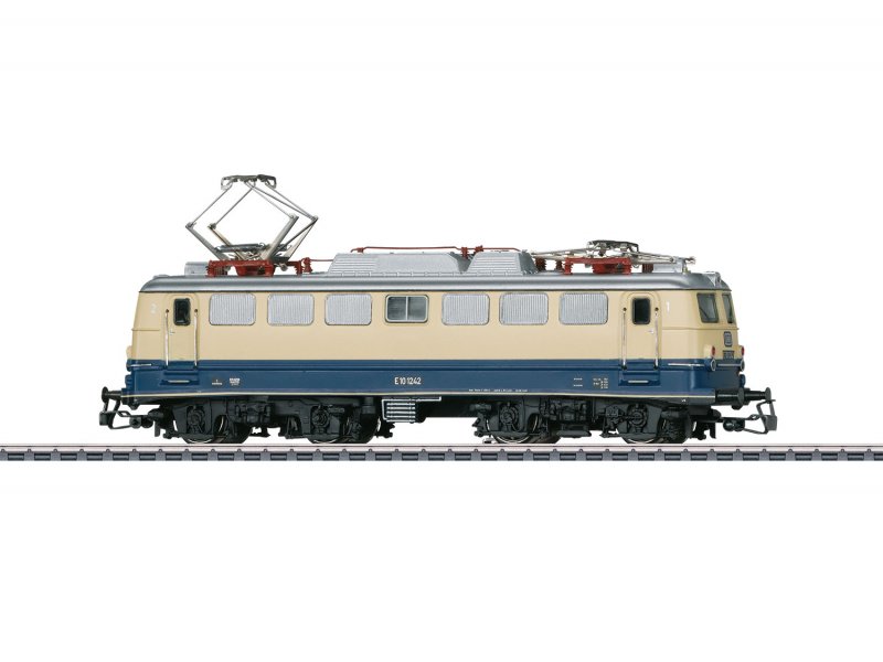 Märklin Klassiker aus den 1960er Jahren. Elegante Rheingold-Farbgebung, Mit Digital-Decoder mfx. Verpackung mit colorierter Darstellung der Lok in Anlehnung an die historische Verpackung der Baureihe E10. Vor 60 Jahren Start des europäischen TEE-Verkehrs am 2. Juni 1957.