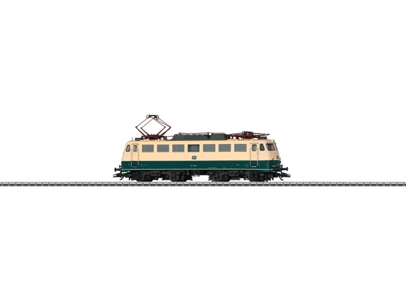 Vorbild: Baureihe 110.3 der Deutschen Bundesbahn (DB). Schnellfahrlokomotive mit aerodynamischer Front, mit der sogenannten "Bügelfalte". Ozeanblau/elfenbein Lackierung. Umbau-Version mit rechteckigen Klatte-Lüftergittern, rechteckigen Maschinenraumfenstern, ohne umlaufende Regenrinne, ohne Schürze und ohne Pufferverkleidung. Betriebszustand um 1985.