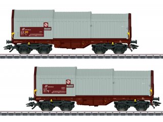 Beide Wagen mit festen Stirnwänden und 3 verschiebbaren Teleskophauben. Innen 5 Lademulden mit beweglichen Haltearmen. 3 Coils liegen bei. Beide Wagen mit unterschiedlichen Betriebsnummern und jeweils einzeln verpackt. Zusätzliche Umverpackung.