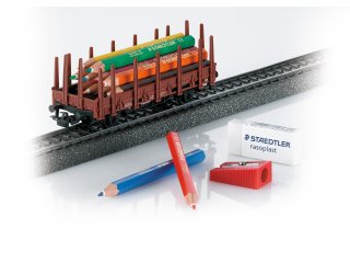 Rungenwagen mit neuer Betriebsnummer. 18 fest stehende Rungen. Relex-Kupplungen. Inklusive 12 kurzen STAEDTLER Farbstiften, einem STAEDTLER Radierer rasoplast sowie einem STAEDTLER Kunststoffspitzer (Kunststoffspitzer kann farblich variieren). Farbstifte dienen als Wagenbeladung.