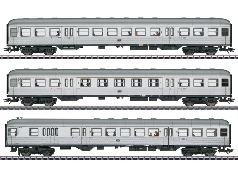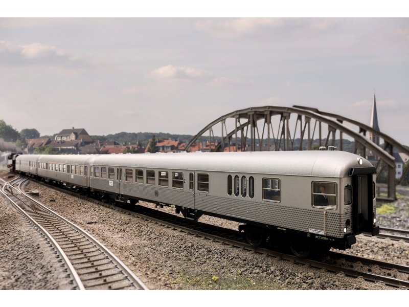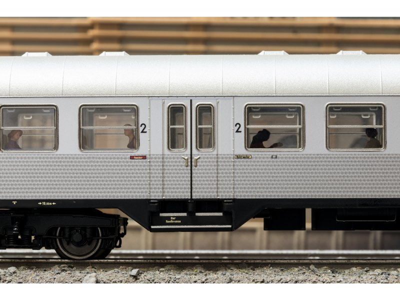Befahrbarer Mindestradius 360 mm. Typspezifisch gestaltete Unterböden. Drehgestelle mit Klotzbremsen. Alle Wagen mit serienmäßig eingebauter LED Innenbeleuchtung und mit trennbaren, Strom führenden Kupplungen. Steuerwagen mit fahrtrichtungsabhängigem Lichtwechsel von 3x Weiß auf 2x Rot analog und digital funktionsfähig. Beleuchtung des Spitzenlichts mit wartungsfreien Leuchtdioden. Schleppschalter. Alle Wagen sind mit zahlreichen Figuren der Fa. Preiser bestückt, der Steuerwagen zusätzlich mit einer Lokführerfigur. Fallrohre und Rangiertritte liegen bei.
