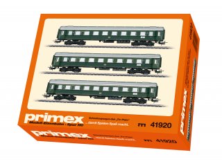 Alle Wagen mit Relex-Kupplungen. Drehgestelle der Bauart Minden-Deutz. Aufgedruckte Zuglaufschilder mit dem Zuglauf: München - Augsburg - Würzburg - Bebra - Hannover - Hamburg-Altona. Unterschiedliche Betriebsnummern. Jeder Wagen in gekennzeichnetem Karton einzeln verpackt, in Anlehnung an die Primex-Verpackungsgestaltung der damaligen Zeit. Zusätzliche Umverpackung.