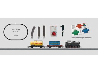 Lokomotive mit Digital-Decoder und Metallfahrwerk. 1 Achse angetrieben, Haftreifen. Niederbordwagen und Kesselwagen "Shell" mit Relex-Kupplungen. Zuglänge 33,8 cm. Ein Karton-Bastelbogen "Container" liegt der Packung als Zubehör und Beladung bei. Inhalt: 12 gebogene Gleise 24130, 2 gerade Gleise 24172, 2 gerade Gleise 24188, Schaltnetzteil 230 V/36 VA und mehrzugfähiges Digital-Fahrgerät (2 Loks gleichzeitig fahrbar und bis zu 4 Loks ansteuerbar).