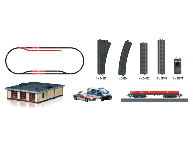 Vierachsiger Niederbordwagen mit 2 abnehmbaren Einsatzfahrzeugen beladen. Wagen mit Relex-Kupplungen. Länge über Puffer 16,0 cm. Inhalt: 5 gerade Gleise 24188, 4 gerade Gleise 24172, 1 gebogenes Gleis 24224, 1 Weiche rechts 24612 und 1 Prellbock 24977. Kunststoff-Bausatz "Feuerwache".