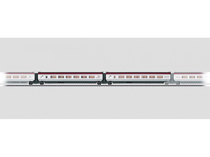 2-teiliges Ergänzungswagen-Set zur Erweiterung des Hochgeschwindigkeitszuges THALYS PBKA, Artikel 37794, auf eine 10-teilige Einheit. Serienmäßig eingebaute Innenbeleuchtung mit wartungsfreien warmweißen Leuchtdioden (LED). Innenbeleuchtung wird versorgt über die durchgehende elektrische Verbindung des ganzen Zuges. Beide Mittelwagen sind fest miteinander gekuppelt. Kulissenführung in den Jakobs-Drehgestellen. Maßstäbliche Nachbildung, daher befahrbarer Gleisbogen ab Mindestradius 360 mm bei freiem Lichtraum. Länge des Wagenpaares 43 cm.