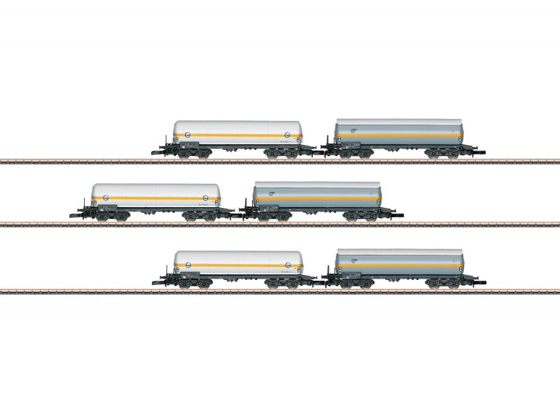 Alle Wagen in Sonderausführung mit Kurzkupplunghaken. Einzeln nicht erhältlich. 3 Wagen mit Sonnenschutzdach. Alle Wagen im Set mit individueller Betriebsnummer. Vorbildgerechte Farbgebung und Beschriftung.