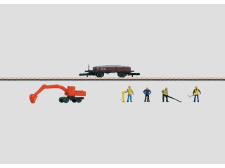 Bahndienstwagen-Set bestehend aus einem fein gestalteten Niederbordwagen beladen mit einem Ladeguteinsatz Gleisschotter. Radbagger aus Metall und 4 Preiser-Figuren mit Werkzeugen.