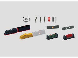Zug mit Batterieantrieb und Magnetkupplungen zwischen den einzelnen Wagen. Festgekuppelte Einheit bestehend aus Lokomotiv- und Batteriewagenchassis. Die beiliegenden Gehäuse von Lok und Batteriewagen können durch eine einfache Steckmechanik beliebig getauscht werden. Der Zug verfügt über 3 Geschwindigkeitsstufen bei Vorwärts- und Rückwärtsfahrt, 3 Soundfunktionen und ein Dreilicht-Spitzensignal. Kippwagen und Behältertragwagen sind steckbare Bausätze und liegen der Packung in Einzelteilen bei. Die Teile können auch individuell verbaut werden. Kunststoffkugeln zur Beladung des Kippwagens liegen ebenfalls bei.