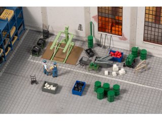 Umfangreiche Ausstattung für Kfz-Werkstätten: eine Scherenhebebühne, ein Ofen, mehrere Fässer, ein Fasswagen, 4 Transportkisten, mehrere Reifen nebst Felgen, Flaschen, Gläser, Gasflaschen, Kisten, Böcke und Werkzeug, auch in Lasercut, lassen keine Wünsche mehr für einen Modellmechaniker offen! Angaben zur Produktsicherheit
