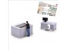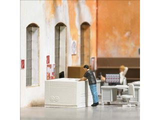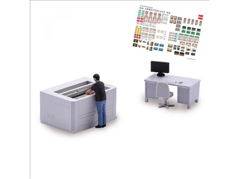 Alles unter Kontrolle! Die Mitarbeiterin steht an der Lasermaschine und prüft das eingelegte Werkstück. Action Set mit Figur, Lasermaschine, Schreibtisch, Flachbildschirm und Bürostuhl sowie Ausschneidebogen für die Arbeitsplatzgestaltung.