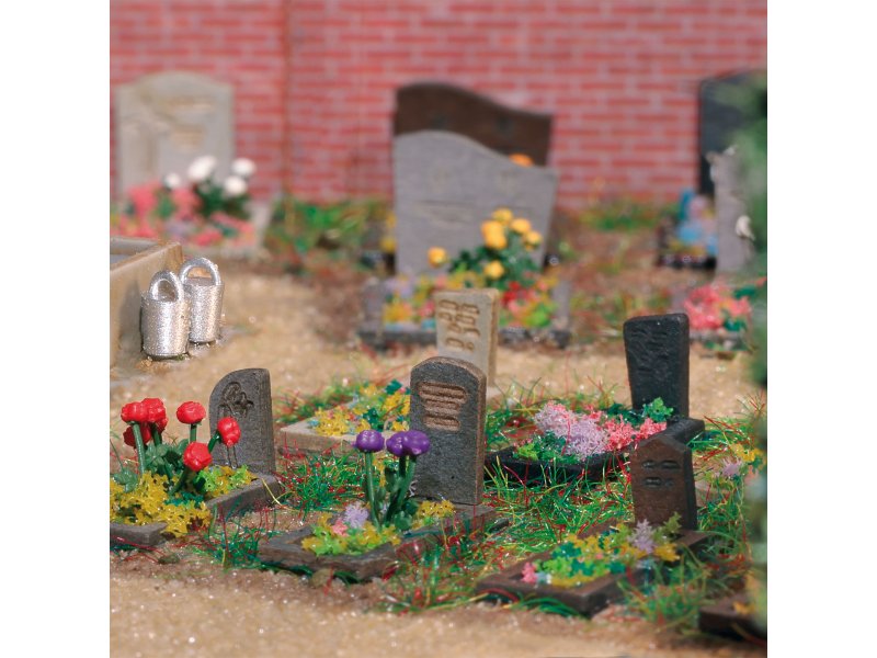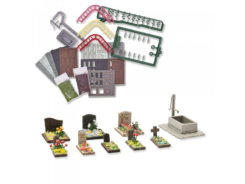 Umfangreiches Set für die Ausgestaltung einer Friedhofsanlage. Inhalt: 40 Grabsteine mit Grabeinfassungen, Schwengelpumpe mit Trog, Rosen, Dahlien sowie Flockmaterial für die Grabgestaltung. Angaben zur Produktsicherheit