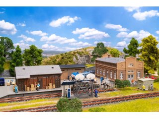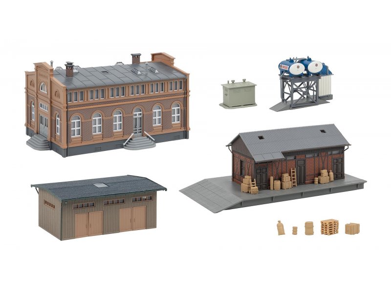 Dieses Aktions-Set verwandelt jeden Bahnhof in einen authentischen Güterumschlagplatz! Das sandfarbene, gemauerte Verwaltungsgebäude sorgt für Ordnung im Betriebsablauf, während der Güterschuppen mit roten Ziegelmauern als Zwischenlager für die Ware dient. Eine schlichte Holzhalle, ein Trafohäuschen und eine Dieseltankstelle runden die Szene ab – perfekt für stimmungsvolle Logistik in Miniatur. Inhalt: Güterschuppen, Lagerhalle, Dieseltankstelle, Trafohäuschen, Verwaltungsgebäude, Dekoration (Fässer, Stoffsack, Paletten, Holzkiste)