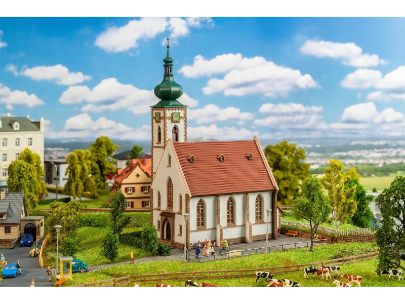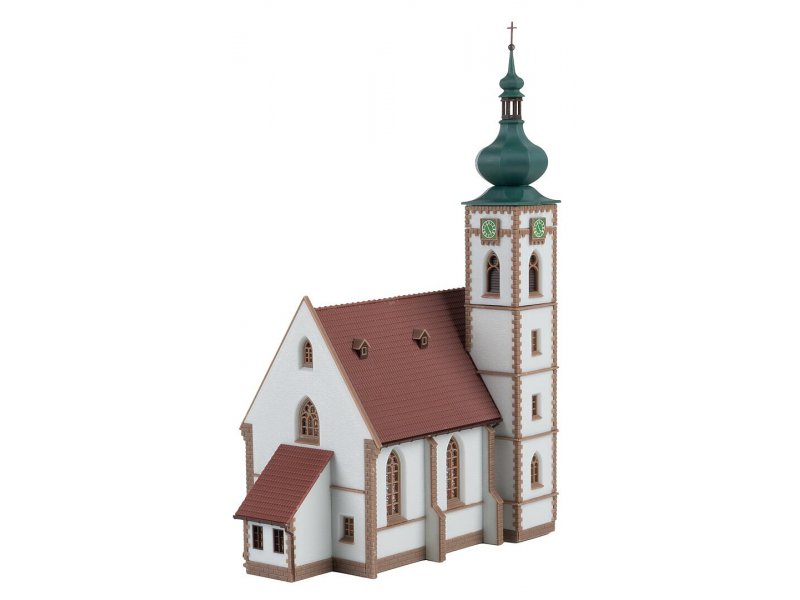 Diese charmante weiße Dorfkirche mit ihrer markanten grünen Zwiebelturmhaube, den bunten Fenstern und der dezenten braunen Mauereinfassung bringt beschaulichen Dorfcharme in die Modelllandschaft. Eine alternative Turmspitze im klassischen Spitzturm-Design liegt bei und ermöglicht gestalterische Freiheit.