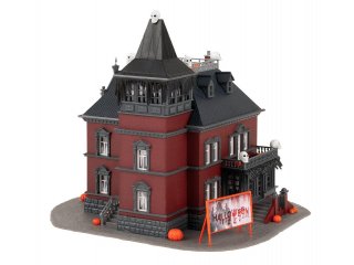 Huch, war das etwa ein Gespenst am Fenster der Villa? Diese erhebt sich mit ihren blutroten Ziegelsteinen und dem düsteren schwarzen Dach auf der Modellbauanlage, während gruselige Totenköpfe von den Dächern und Emporen hinunterblitzen. Ein warnendes Schild verkündet Besuchern: Hier wird Halloween gefeiert! Wie ein Geist schwebt über dem Dach ein orangener Heißluftballon und grinst mit seiner Fratze höhnisch auf die Szenerie herab. Um das Anwesen herum sind unterschiedlich große Kürbisse platziert. Wer würde sich vor diesem Miniatur-Schreckensspaß nicht fürchten? Inhalt: Villa mit Halloween-Schild, Heißluftballon, Dekorationselemente (Kürbisse und Totenköpfe)