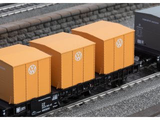 Behälter-Transportwagen mit neu konstruiertem Wagenboden. Beladen mit insgesamt sechs neu konstruierten Volkswagen Transportbehältern. Transportbehälter mit unterschiedlichen Betriebsnummern.