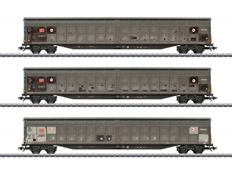 Verstellbare Puffer und Drehgestelle. Großflächig gealtert. Alle Wagen einzeln verpackt in zusätzlicher Umverpackung.