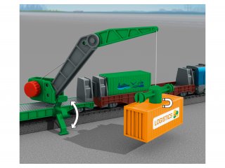 Lokomotive mit Akkuantrieb und Magnetkupplung am hinteren Fahrzeugende. Motor, Akku und die gesamte Elektronik sind für Kinder unzugänglich verbaut. Die Lok kann mit dem mitgelieferten USB-Ladekabel aufgeladen werden. Jeweils 3 Geschwindigkeitsstufen bei Vorwärts- und Rückwärtsfahrt, sowie 3 Soundfunktionen und ein Dreilicht-Spitzensignal, sind über den kindgerechten Märklin Power Control Stick steuerbar. Containerwagen und Kranwagen mit Magnetkupplungen. Die kindgerechten, stabilen Container können geöffnet und beladen werden. Ein fest verbautes Metallteil in den Containern ermöglicht die magnetische Verladung mit dem beiliegenden Kranwagen. Der Kranwagen verfügt über 4 klappbare Verladestützen. Der Kran ist drehbar und der magnetische Verladehaken lässt sich per Handkurbel auf und ab bewegen.