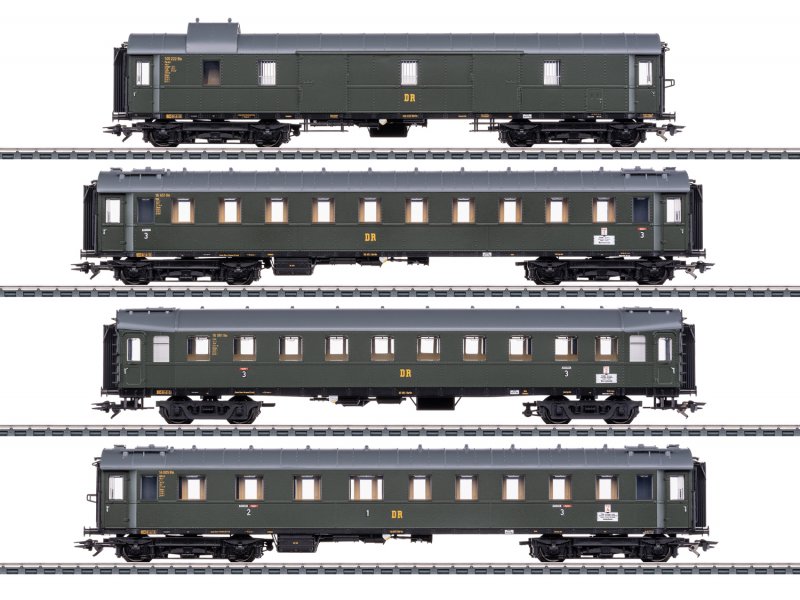 Detaillierte Ausführung im vollen Längenmaßstab. Befahrbarer Mindestradius 360 mm. Drehgestelle der Bauart Görlitz II schwer für die Wagen der Einheitsbauart 1928-30, sowie Schwanenhals-Drehgestelle für den der Bauart 1923 "Hecht". Aufstiegsleitern und angesetzte Griffstangen. Teilweise mehrfarbige Inneneinrichtungen. Aufgedruckte Wagenlaufschilder und Ordnungsnummern. Kurze Faltenbälge liegen zum Tausch bei. Wagen der Bauart 1928-30 vorbereitet für den Einbau stromführender Kurzkpplungen 72024, LED-Innenbeleuchtung 73410/73411 und Schleifer 73406. Wagen der Bauart 1923 "Hecht" vorbereitet für den Einbau der stromführenden Kurzkupplungen 72022, LED-Innenbeleuchtung 73410/73411 und Schleifer 73404. Alle Wagen einzeln verpackt in zusätzlicher Umverpackung.
